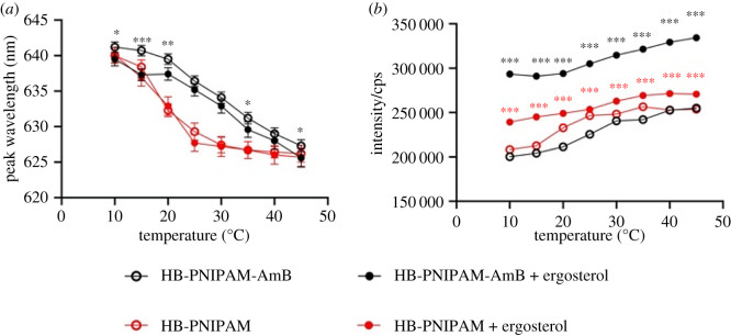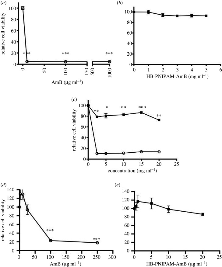 Branched poly(N-isopropylacrylamide) was functionalized with Amphotericin B (AmB) at the chain ends to produce an antifungal material. The polymer showed antifungal properties against AmB-sensitive strains of Candida albicans, Fusarium keratoplasticum and Aspergillus flavus (minimal inhibitory concentration ranged from 5 to 500 µg ml-1) but was not effective against an AmB resistant strain of C. albicans nor against Candida tropicalis. The polymer end groups bound to the AmB target, ergosterol, and the fluorescence spectrum of a dye used as a solvatochromic probe, Nile red, was blue shifted indicating that segments of the polymer became desolvated on binding. The polymer was less toxic to corneal and renal epithelial cells and explanted corneal tissue than the free drug. Also, the polymer did not induce reactive oxygen species release from peripheral blood mononuclear cells, nor did it cause a substantial release of the proinflammatory cytokines, tumour necrosis factor-α and interleukin-1β (at 0.5 mg ml-1).