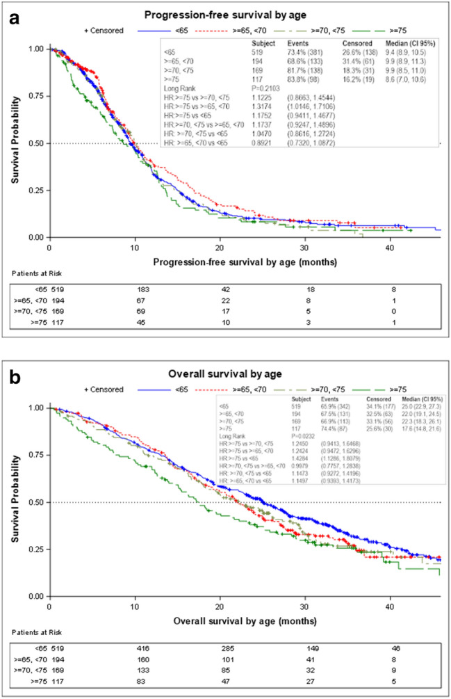 Results: In total, 999 patients from five studies were included in the analysis: 480 (48%) were aged ≥ 65 years, and 519 (52%) were aged < 65 years. Median PFS did not differ significantly between patients aged ≥ 65 and < 65 years (9.9 vs. 9.4 months; hazard ratio [HR] 1.01; 95% confidence interval [CI] 0.88-1.17). Median OS was significantly shorter in older than in younger patients (21.3 vs. 25.0 months; HR 1.21; 95% CI 1.04-1.41). There was no significant difference between older and younger patients in ORR (59 vs. 62%). Patients aged ≥ 65 years experienced significantly more treatment-related grade 3 or higher adverse events (61.67%) than did patients aged < 65 years (45.86%).