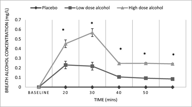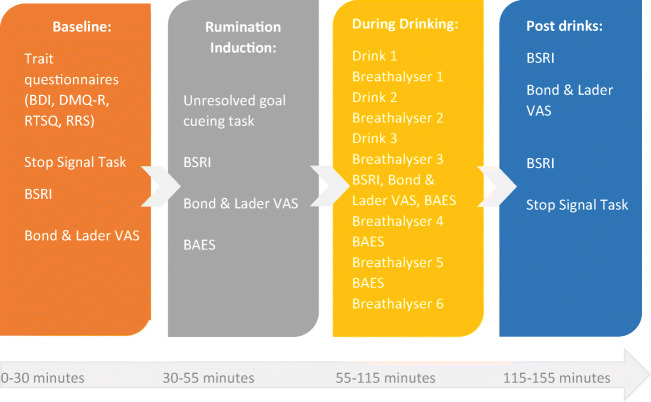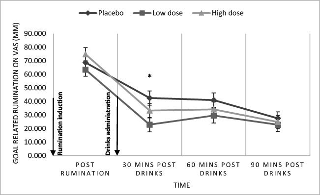 Methods: We conducted a randomised placebo-controlled laboratory study to examine the effect of low (0.4 g kg-1) and high doses (0.8 g kg-1) of alcohol on state rumination compared to placebo. Participants completed a rumination induction task prior to receiving drinks. We then measured state rumination and mood at repeated time points; 30 min, 60 min and 90 min post-drinks consumption.