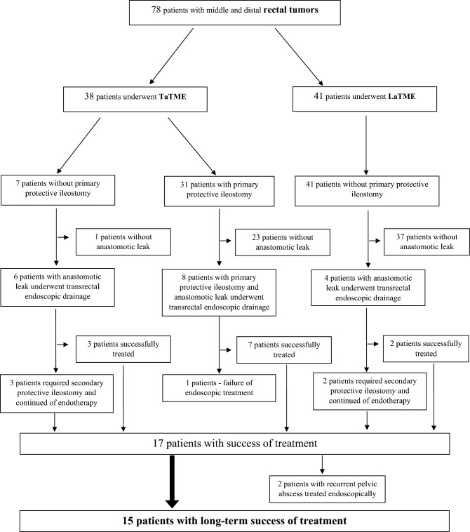 Results: Seventy-nine patients with middle and distal rectal tumors underwent laparoscopic resection. Intestinal anastomotic leak was identified in 18 (22.79%) patients [all men, mean age 61.39 (43-86) years] during the postoperative period. Primary protective ileostomy was performed in 8/18 (44.44%) patients. All 18 patients were treated with endoluminal vacuum therapy via transrectal endoscopic drainage. The mean time from surgery to the diagnosis of leakage and initiation of endoscopic treatment was 16 (3-728) days. The mean number of endoscopic procedures per patient was 6 (1-11). The mean duration of endoscopic treatment was 22 (4-43) days. Complications of endotherapy occurred in 2/18 (11.11%) patients treated endoscopically for bleeding from the abscess cavity. Success of endoluminal vacuum therapy was achieved in 17/18 (94.44%) patients. Moreover, 5/18 (27.78%) patients required ileostomy during the endoscopic treatment. The mean follow-up period was 368 (118-724) days. Long-term success of transrectal endoscopic drainage using vacuum-assisted therapy was achieved in 15/18 (83.33%) patients.