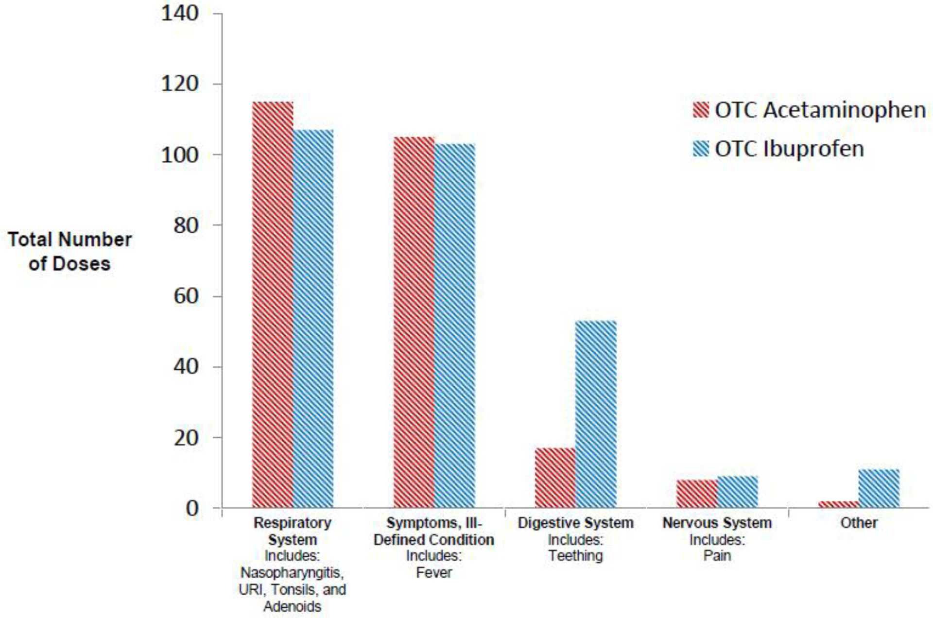 Results: 4195 doses of acetaminophen or ibuprofen were received by children during the study which included 3664 doses (87.3%) of blinded study medication adhering to the protocol and 531 doses (12.7%) of OTC products deviating from the protocol with better adherence among those randomized to ibuprofen as compared to acetaminophen (89.5% vs. 85.5% of doses, p < 0.01). Individually, 227 participants (75.7%) remained fully adherent by not receiving any OTC medications. Pre-study preference for either acetaminophen or ibuprofen by the participants' families was not associated with differential rates of adherence to the blinded medication.