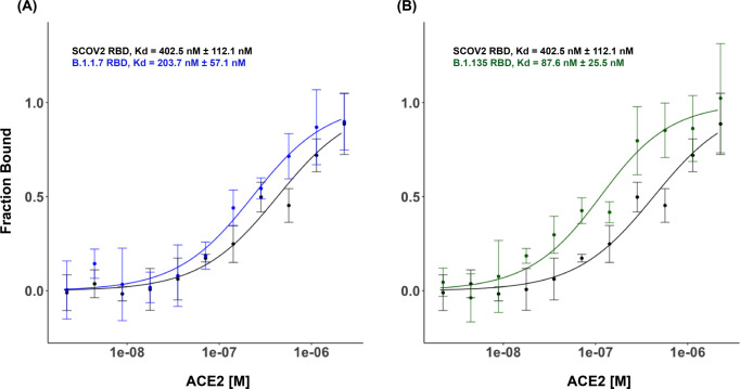 SARS-CoV-2 B.1.1.7 and B.1.351 spike variants bind human ACE2 with increased affinity.Lancet Infect Dis. 2021 Aug;21(8):1070. doi: 10.1016/S1473-3099(21)00262-0. Epub 2021 May 19. Lancet Infect Dis. 2021. PMID: 34022142 Free PMC article. No abstract available.