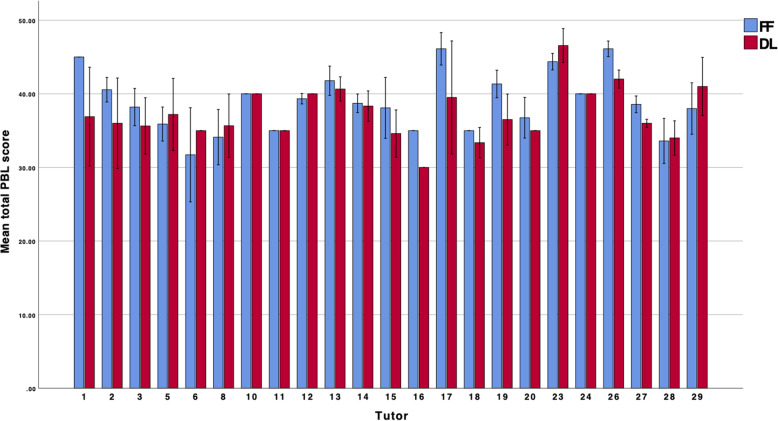 Result: We matched 62 students in each group. With four tutorials, there were 490 observations, with 245 in each group. The mean total score for the DL group was 37.5 ± 4.6, which was significantly lower than that of the FF group (39.0 ± 4.4, p < 0.001). We noted that students in the DL group had a significantly lower scores for all five areas of proficiency: participation, communication, preparation, critical thinking and group skills.