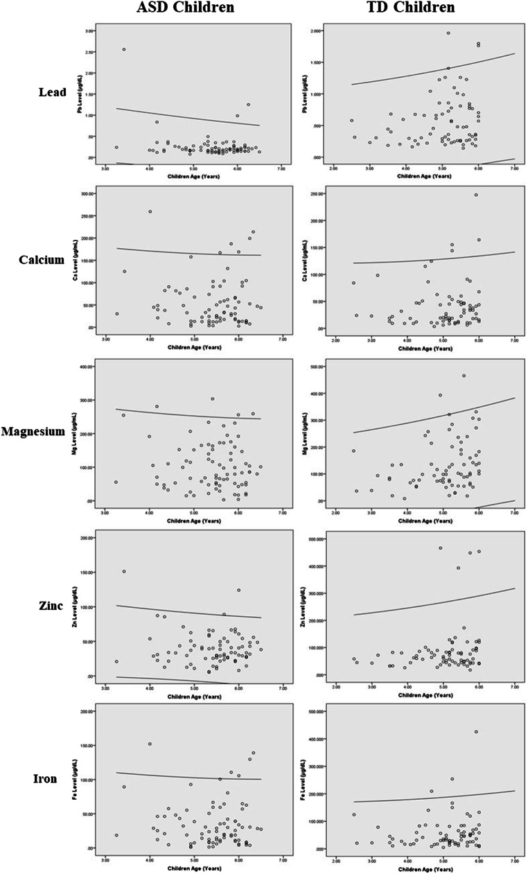 Lead (Pb) is a heavy metal which is abundant in the environment and known to cause neurotoxicity in children even at minute concentration. However, the trace elements calcium (Ca), magnesium (Mg), zinc (Zn) and iron (Fe) are essential to children due to its protective effect on neurodevelopment. The primary objective of this study was to assess the role of Pb and trace elements in the development of autism spectrum disorder (ASD) among preschool children. A total of 81 ASD children and 74 typically developed (TD) children aged between 3 and 6 years participated in the study. Self-administered online questionnaires were completed by the parents. A first-morning urine sample was collected in a sterile polyethene urine container and assayed for Pb, Ca, Mg, Zn and Fe using an inductively coupled plasma mass spectrometry (ICP-MS). Comparisons between groups revealed that the urinary Pb, Mg, Zn and Fe levels in ASD children were significantly lower than TD children. The odds of ASD reduced significantly by 5.0% and 23.0% with an increment of every 1.0 μg/dL urinary Zn and Fe, respectively. Post interaction analysis showed that the odds of ASD reduced significantly by 11.0% and 0.1% with an increment of every 1.0 μg/dL urinary Zn and Pb, respectively. A significantly lower urinary Pb level in ASD children than TD children may be due to their poor detoxifying mechanism. Also, the significantly lower urinary Zn and Fe levels in ASD children may augment the neurotoxic effect of Pb.