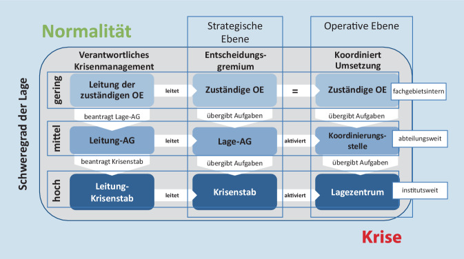 Das Robert Koch-Institut (RKI) spielt in Deutschland eine zentrale Rolle bei der Bewältigung von Gesundheitsgefahren biologischen Ursprungs. Das Krisenmanagement des RKI hat das Ziel, dazu beizutragen, die Gesundheit der Menschen in Deutschland in epidemisch bedeutsamen Lagen zu schützen und die Arbeitsfähigkeit des RKI auch bei hoher Belastung über längere Zeit aufrechtzuerhalten. In diesem Artikel wird das Krisenmanagement des RKI generell und speziell während der COVID-19-Pandemie zum Stand 31.10.2020 dargestellt. Es werden die generischen RKI-Krisenmanagementstrukturen und der Aufbau des RKI-Lagezentrums, deren Operationalisierung im Rahmen der COVID-19-Pandemie sowie die aufgetretenen Herausforderungen beschrieben. Ebenso wird der Bund-Länder-Austausch während der bisherigen Pandemie dargestellt.Die COVID-19-Pandemie hat außergewöhnliche Umstände mit sich gebracht. Eine gute Kommunikation und Koordination während der Lage sind essenziell, sowohl RKI-intern als auch mit anderen Bundes- oder Länderbehörden und der Fachöffentlichkeit. Unter hohem Druck erstellt das RKI Empfehlungen, Stellungnahmen und Bewertungen zu verschiedenen Themen und aktualisiert diese regelmäßig. Für die operative Unterstützung aller Aktivitäten wurde am RKI ein Lagezentrum aktiviert. Während der COVID-19-Pandemie gibt es verschiedene sowohl personelle als auch strukturelle Herausforderungen. Es zeigte sich, dass eine gute Vorbereitung (z. B. bereits vorhandene Positionsbeschreibungen und Räumlichkeiten) das Krisenmanagement positiv beeinflusst.