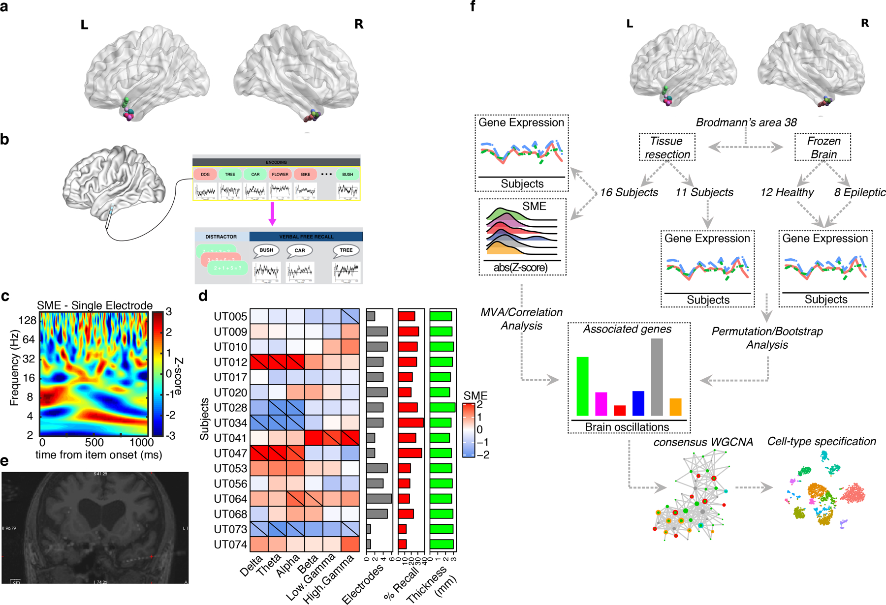 In humans, brain oscillations support critical features of memory formation. However, understanding the molecular mechanisms underlying this activity remains a major challenge. Here, we measured memory-sensitive oscillations using intracranial electroencephalography recordings from the temporal cortex of patients performing an episodic memory task. When these patients subsequently underwent resection, we employed transcriptomics on the temporal cortex to link gene expression with brain oscillations and identified genes correlated with oscillatory signatures of memory formation across six frequency bands. A co-expression analysis isolated oscillatory signature-specific modules associated with neuropsychiatric disorders and ion channel activity, with highly correlated genes exhibiting strong connectivity within these modules. Using single-nucleus transcriptomics, we further revealed that these modules are enriched for specific classes of both excitatory and inhibitory neurons, and immunohistochemistry confirmed expression of highly correlated genes. This unprecedented dataset of patient-specific brain oscillations coupled to genomics unlocks new insights into the genetic mechanisms that support memory encoding.