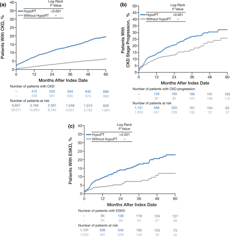 Methods: A retrospective cohort study using a managed care claims database in the United States from January 2007 to June 2017 included patients with chronic hypoparathyroidism (excluding those receiving parathyroid hormone) and randomly selected patients without hypoparathyroidism followed for up to 5 years. Main outcome measures were (1) development of CKD, defined as new diagnosis of CKD stage 3 and higher or ≥ 2 eGFR measurements < 60 ml/min/1.73 m2 ≥ 3 months apart, (2) progression of CKD, defined as increase in baseline CKD stage, (3) progression to end-stage kidney disease (ESKD), and (4) eGFR decline ≥ 30% from baseline. Time-to-event analyses included Kaplan-Meier analyses with log-rank tests, and both unadjusted and adjusted Cox proportional hazards models were used to compare outcomes between cohorts.