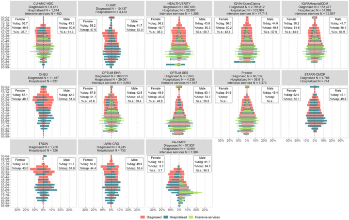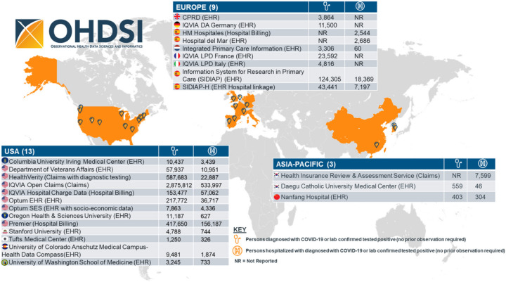 Ms. Kostka is an employee of IQVIA. Mr. Sena is an employee and holds stock at Janssen Research & Development, a Johnson and Johnson family of companies. Dr. Golozar reports personal fees from Regeneron Pharmaceuticals, outside the submitted work. She is a full-time employee at Regeneron Pharmaceuticals. This work was not conducted at Regeneron Pharmaceuticals. Dr. Nyberg reports other funding from AstraZeneca, outside the submitted work. Dr. Wilcox reports grants from Bill and Melinda Gates Foundation, grants from National Institute of Health, during the conduct of the study Mr. Andryc is an employee of Janssen Research & Development, a subsidiary of Johnson & Johnson. Dr. Reich is an employee of IQVIA. Dr. Blacketer reports she is an employee and holds stock at Janssen Research & Development, a Johnson and Johnson family of companies. Dr. Morales is supported by a Wellcome Trust Clinical Research Development Fellowship (Grant 214588/Z/18/Z) and reports grants from Chief Scientist Office (CSO), grants from Health Data Research UK (HDR-UK), grants from National Institute of Health Research (NIHR), outside the submitted work. Mr. DeFalco reports he is an employee and holds stock at Janssen Research & Development, a Johnson and Johnson family of companies. Jason Thomas reports grants from Bill and Melinda Gates Foundation, grants from National Institute of Health, during the conduct of the study. Dr. Posada reports grants from National Library of Medicine, during the conduct of the study. Dr. Natarajan reports grants from US NIH, during the conduct of the study. Dr. Matheny reports grants from US NIH, grants from US VA HSR&D, during the conduct of the study. Dr. Weiskopf reports personal fees from Merck, outside the submitted work. Dr. Shah reports grants from National Library of Medicine, during the conduct of the study. Dr. Park reports grants from Ministry of Trade, Industry & Energy, Republic of Korea, grants from Ministry of Health & Welfare, Republic of Korea, grants from Bill & Melinda Gates Foundation, during the conduct of the study. Ms. Seager is an employee of IQVIA. Dr. DuVall reports grants from Anolinx, LLC, grants from Astellas Pharma, Inc, grants from AstraZeneca Pharmaceuticals LP, grants from Boehringer Ingelheim International GmbH, grants from Celgene Corporation, grants from Eli Lilly and Company, grants from Genentech Inc., grants from Genomic Health, Inc., grants from Gilead Sciences Inc., grants from GlaxoSmithKline PLC, grants from Innocrin Pharmaceuticals Inc., grants from Janssen Pharmaceuticals, Inc., grants from Kantar Health, grants from Myriad Genetic Laboratories, Inc., grants from Novartis International AG, grants from Parexel International Corporation through the University of Utah or Western Institute for Veteran Research outside the submitted work. Dr. Fortin is an employee of Janssen R&D, a subsidiary of Johnson and Johnson. Dr. Vignesh reports grants from State of Arizona; Arizona Board of Regents, during the conduct of the study; grants from National Science Foundation, grants from Agency for Healthcare Research and Quality, grants from National Institutes of Health, outside the submitted work; .Dr. Subbian reports grants from State of Arizona; Arizona Board of Regents, during the conduct of the study; grants from National Science Foundation, grants from Agency for Healthcare Research and Quality, grants from National Institutes of Health, outside the submitted work. Dr. Rijnbeek reports grants from Innovative Medicines Initiative, from Janssen Research and Development, during the conduct of the study. Dr. Hripcsak reports grants from US NIH, during the conduct of the study. Dr. Ryan reports and is employee of Janssen Research and Development and shareholder of Johnson & Johnson. Dr. Suchard reports grants from US National Institutes of Health, grants from Department of Veterans Affairs, during the conduct of the study; grants from IQVIA, personal fees from Janssen Research and Development, grants from US Food and Drug Administration, personal fees from Private Health Management, outside the submitted work. Dr. Prieto-Alhambra reports grants and other from AMGEN, grants, non-financial support and other from UCB Biopharma, grants from Les Laboratoires Servier, outside the submitted work; and Janssen, on behalf of IMI-funded EHDEN and EMIF consortiums, and Synapse Management Partners have supported training programmes organised by DPA’s department and open for external participants.