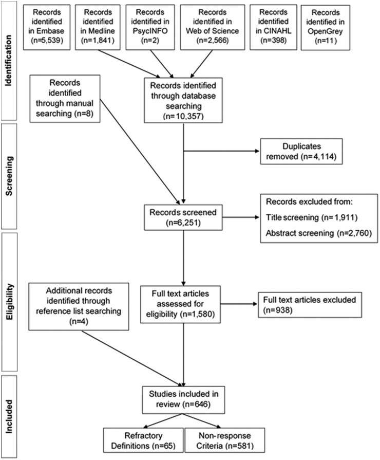 Results: Of 6251 studies screened, 646 met the inclusion criteria; 581 of these applied non-response criteria while 65 provided refractory disease definitions/descriptions. From the non-response studies, 39 different components included various disease activity measures, emphasizing persistent disease activity and symptoms, despite treatment with one or more biologic DMARD (bDMARD). From papers with clear definitions for refractory disease, 41 components were identified and categorized into three key themes: resistance to multiple drugs with different mechanisms of action, typically two or more bDMARDs; persistence of symptoms and disease activity; and other contributing factors. The most common term used was 'refractory' (80%), while only 16.9% reported explicitly how their definition was generated (e.g. clinical experience or statistical methods).