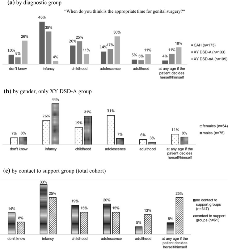 Controversy continues over a proposed moratorium on elective genital surgery in childhood for disorders/differences of sex development (DSD). Empirical evidence on patient preference is needed to inform decision-making. We conducted a multicentre survey by cross-sectional questionnaire in 14 specialized clinics in six European countries. The sample comprised 459 individuals (≥ 16 years) with a DSD diagnosis, including individuals with congenital adrenal hyperplasia (CAH) (n = 192), XY DSD with prenatal androgen effect (A) (n = 150), and without (nA) (n = 117). Main outcome measures were level of agreement with given statements regarding genital surgery, including clitoris reduction, vaginoplasty, and hypospadias repair. A total of 66% of individuals with CAH and 60% of those with XY DSD-A thought that infancy or childhood were the appropriate age for genital surgery. Females with XY DSD were divided on this issue and tended to prefer vaginoplasty at a later age (XY DSD-A 39%, XY DSD-nA 32%). A total of 47% of males preferred early hypospadias surgery. Only 12% (CAH), 11% (XY DSD-A), and 21% (XY DSD-nA) thought they would have been better off without any surgery in childhood or adolescence. Individuals who had early genital surgery were more likely to approve of it. Outcome data failed to support a general moratorium on early elective genital surgery. Participant perspectives varied considerably by diagnostic category, gender, history of surgery, and contact with support groups. Case-by-case decision-making is better suited to grasping the ethical complexity of the issues at stake.Trial registration: German Clinical Trials Register DRKS00006072.