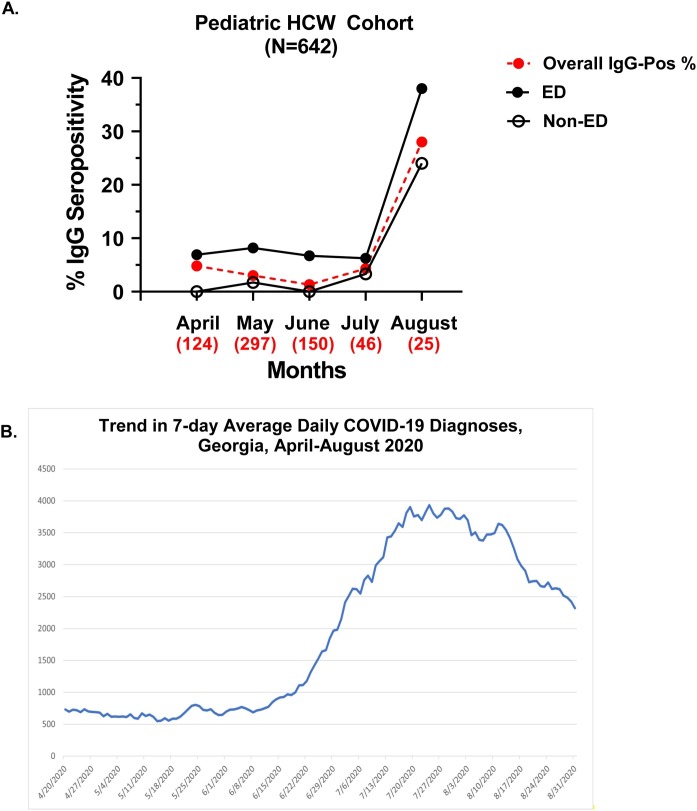 Results: Most of 642 pHCWs enrolled were 31-40years, female and had no comorbidities. Half had children in their home, 49% had traveled, 42% reported an illness since January, 31% had a known COVID-19 exposure, and 8% had SARS-CoV-2 PCR testing. High COVID-19 pandemic anxiety was reported by 71%. Anti-SARS-CoV-2-IgG prevalence was 4.1%; 8.4% among ED versus 2.0% among non-ED pHCWs (p < 0.001). ED-work location and known COVID-19 exposure were independent risk factors. 31% of antibody-positive pHCWs reported no symptoms. Prevalence significantly (p < 0.001) increased from 3.0% in April-June to 12.7% in July-August.