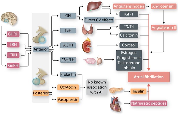 Hormones are potent endo-, para-, and autocrine endogenous regulators of the function of multiple organs, including the heart. Endocrine dysfunction promotes a number of cardiovascular diseases, including atrial fibrillation (AF). While the heart is a target for endocrine regulation, it is also an active endocrine organ itself, secreting a number of important bioactive hormones that convey significant endocrine effects, but also through para-/autocrine actions, actively participate in cardiac self-regulation. The hormones regulating heart-function work in concert to support myocardial performance. AF is a serious clinical problem associated with increased morbidity and mortality, mainly due to stroke and heart failure. Current therapies for AF remain inadequate. AF is characterized by altered atrial function and structure, including electrical and profibrotic remodelling in the atria and ventricles, which facilitates AF progression and hampers its treatment. Although features of this remodelling are well-established and its mechanisms are partly understood, important pathways pertinent to AF arrhythmogenesis are still unidentified. The discovery of these missing pathways has the potential to lead to therapeutic breakthroughs. Endocrine dysfunction is well-recognized to lead to AF. In this review, we discuss endocrine and cardiocrine signalling systems that directly, or as a consequence of an underlying cardiac pathology, contribute to AF pathogenesis. More specifically, we consider the roles of products from the hypothalamic-pituitary axis, the adrenal glands, adipose tissue, the renin-angiotensin system, atrial cardiomyocytes, and the thyroid gland in controlling atrial electrical and structural properties. The influence of endocrine/paracrine dysfunction on AF risk and mechanisms is evaluated and discussed. We focus on the most recent findings and reflect on the potential of translating them into clinical application.
