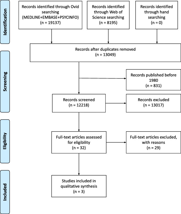 Results: After removing duplicates, a total of 12,218 titles/abstracts were screened. Inclusion and exclusion criteria were followed, and three articles were eventually selected.