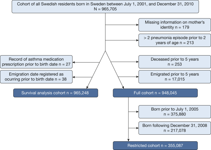 Study design and methods: This study was a nationwide register-based cohort analysis of > 900,000 Swedish children to assess the association between pneumonia in infancy and prevalent asthma at 4 years. A secondary aim was to assess if the association has changed after the introduction of nationwide pneumococcal conjugate vaccine (PCV) immunization as this has led to a shift in pneumonia etiology. The study controlled for important confounders, including shared environmental and familial confounding, by using sibling analyses.