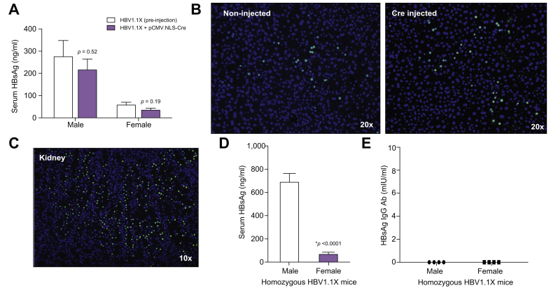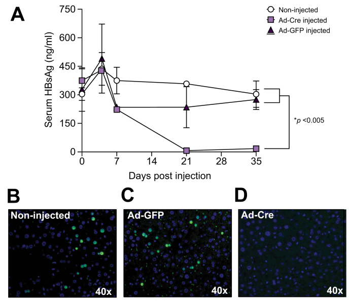 Results: We demonstrated induction of recombinant cccDNA (rcccDNA) formation via viral or transgenic Cre expression in HBV1.1X mice, and the ability to regulate HBsAg and HBc expression with Cre in mice. Tamoxifen-inducible Cre could markedly downregulate baseline HBsAg levels from the integrated HBV genome. To demonstrate clearance of HBV from HBV1.1X mice, we administered adenovirus expressing Cre, which permanently and significantly reduced HBsAg and core antigen levels in the murine liver via rcccDNA excision and a subsequent immune response.