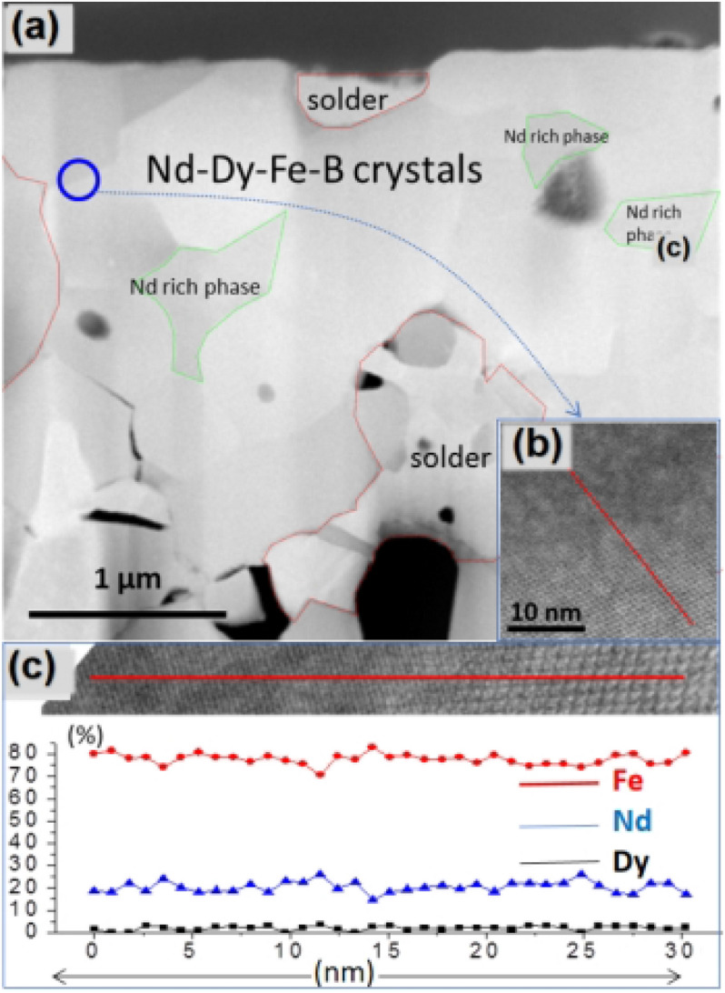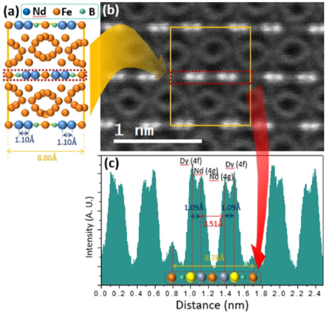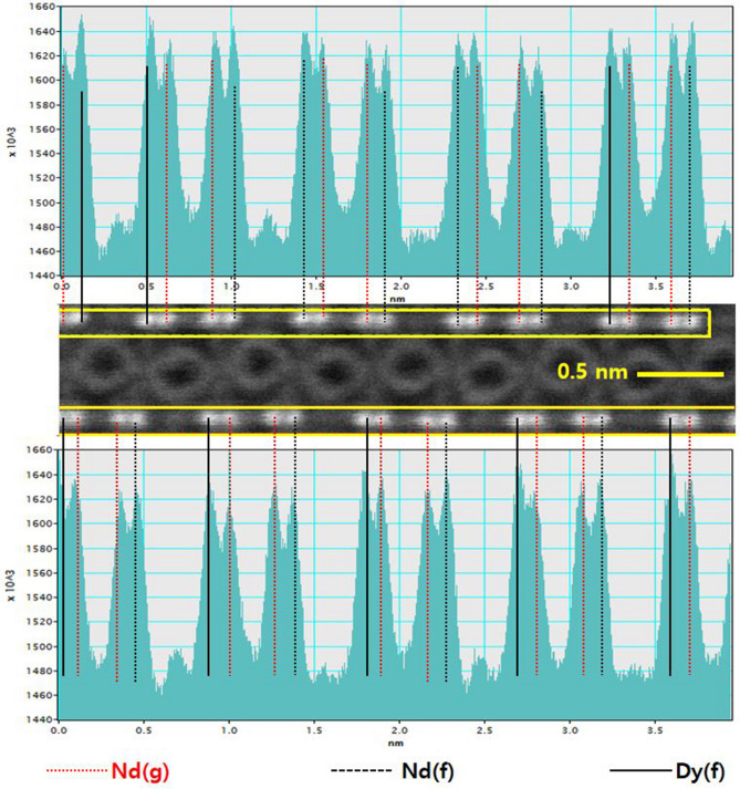 Determination of Dy substitution site in Nd2-xDyxFe14B by HAADF-STEM and illustration of magnetic anisotropy of "g" and "f" sites, before and after substitution