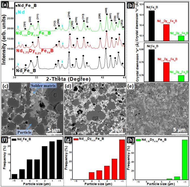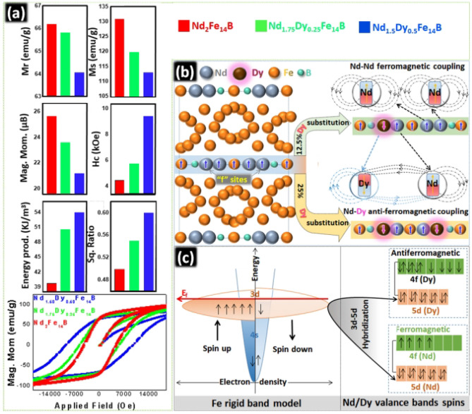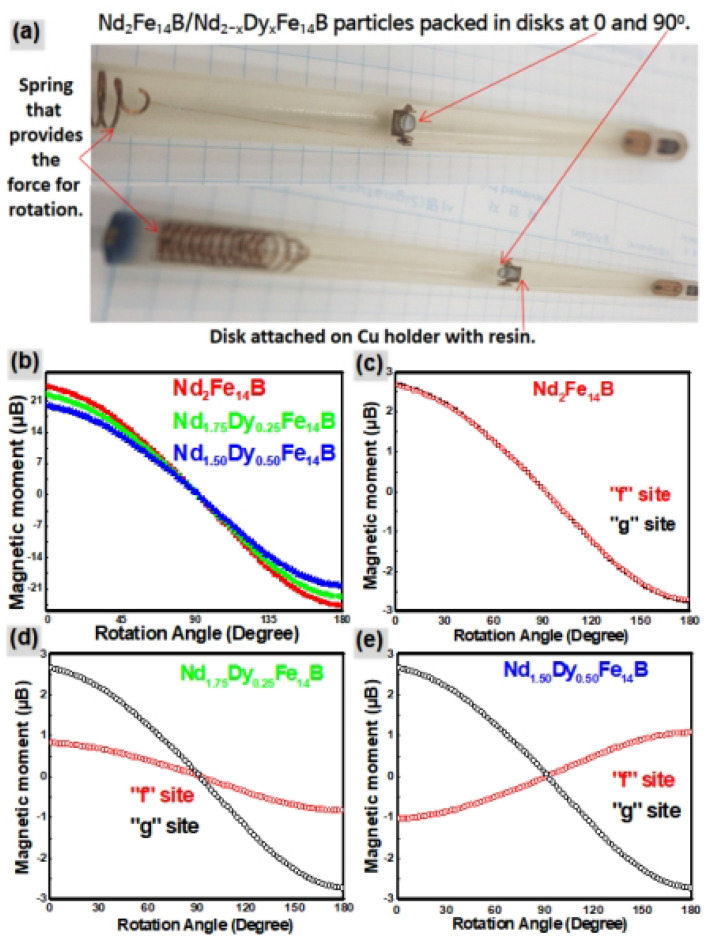 Nd2Fe14B and Nd2-xDyxFe14B (x = 0.25, 0.50) particles were prepared by the modified co-precipitation followed by reduction-diffusion process. Bright field scanning transmission electron microscope (BF-STEM) image revealed the formation of Nd-Fe-B trigonal prisms in [- 101] viewing zone axis, confirming the formation of Nd2Fe14B/Nd2-xDyxFe14B. Accurate site for the Dy substitution in Nd2Fe14B crystal structure was determined as "f" site by using high-angle annular dark field scanning transmission electron microscope (HAADF-STEM). It was found that all the "g" sites are occupied by the Nd, meanwhile Dy occupied only the "f" site. Anti-ferromagnetic coupling at "f" site decreased the magnetic moment values for Nd1.75Dy0.25Fe14B (23.48 μB) and Nd1.5Dy0.5Fe14B (21.03 μB) as compared to Nd2Fe14B (25.50 μB). Reduction of magnetic moment increased the squareness ratio, coercivity and energy product. Analysis of magnetic anisotropy at constant magnetic field confirmed that "f" site substitution did not change the patterns of the anisotropy. Furthermore, magnetic moment of Nd2Fe14B, Nd2-xDyxFe14B, Nd ("f" site), Nd ("g" site) and Dy ("f" site) was recorded for all angles between 0° and 180°.
