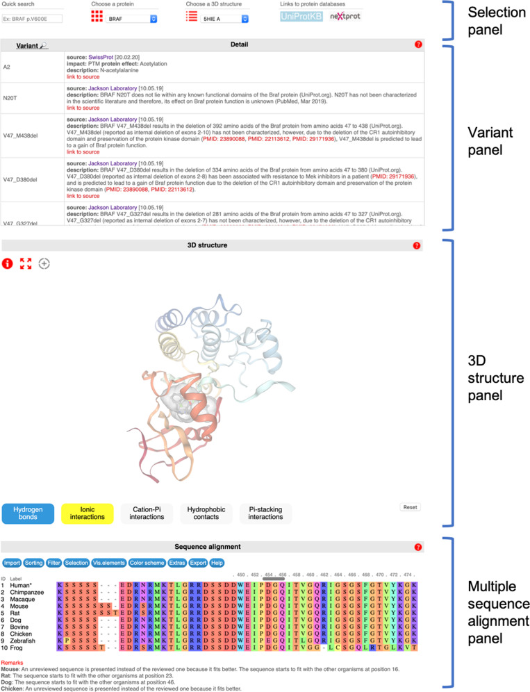 Swiss-PO is a new web tool to map gene mutations on the 3D structure of corresponding proteins and to intuitively assess the structural implications of protein variants for precision oncology. Swiss-PO is constructed around a manually curated database of 3D structures, variant annotations, and sequence alignments, for a list of 50 genes taken from the Ion AmpliSeqTM Custom Cancer Hotspot Panel. The website was designed to guide users in the choice of the most appropriate structure to analyze regarding the mutated residue, the role of the protein domain it belongs to, or the drug that could be selected to treat the patient. The importance of the mutated residue for the structure and activity of the protein can be assessed based on the molecular interactions exchanged with neighbor residues in 3D within the same protein or between different biomacromolecules, its conservation in orthologs, or the known effect of reported mutations in its 3D or sequence-based vicinity. Swiss-PO is available free of charge or login at