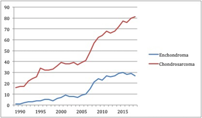 Results: There was a total of 1507 CS showing a 68% overall increase in annual referral rate/incidence over the study period. 68% cases were the borderline malignant lesions now known as atypical cartilaginous tumour (ACT). The annual referral rate/incidence of this entity increased by 194% over the 30 years. Whereas, the annual referral rate/incidence for osteosarcoma and Ewing sarcoma was static for the past 20 years.