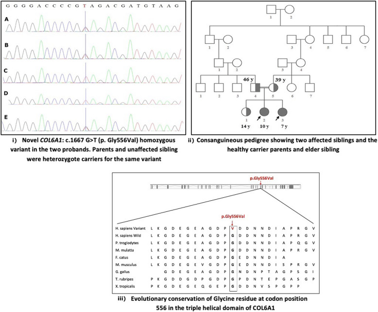 Case presentation: Two sisters, aged 10-years and 7-years, presented with progressive, bilateral proximal muscle weakness. Both probands had delayed motor milestones and demonstrated difficulty in standing from a squatting position, climbing stairs and raising arms above the shoulders. Cognitive, language and social development were age appropriate. Examination showed proximal muscle weakness of the upper and lower extremities and hyperlaxity of the wrist and fingers in both with some variability in clinical severity noted between the two siblings. Serum creatine kinase levels were elevated, and electromyography showed low polyphasic motor unit potentials in the 10-year-old and myopathic features with short duration motor unit potentials with no polyphasia in the 7-year-old. Whole exome sequencing (WES) was performed and a novel, homozygous missense, likely pathogenic variant in exon 25 of COL6A1 gene [NM_001848: c.1667G > T;NP_001839.2:p.Gly556Val] was identified in both probands. This variant was validated by Sanger sequencing in proband 1 as well as proband 2, and the parents and an unaffected sibling were found to be heterozygote carriers for the same variant.
