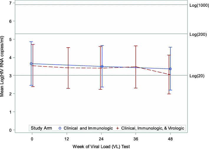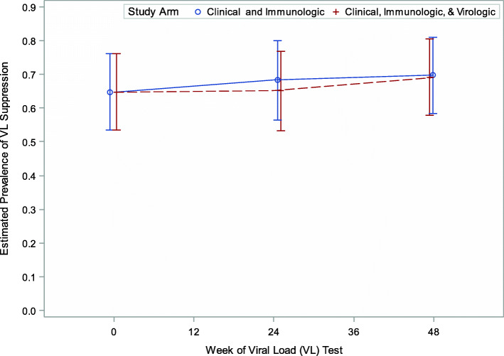 Methods: HIV-infected Ugandan children aged 1-12 years from HIV-care programs with > 1 year of first-line ART using only immunologic and clinical criteria to monitor response to treatment were screened in 2010. Eligible children were stratified by VL ≤ 400 and > 400 copies/ml randomized to clinical and immunological (control) versus clinical, immunological and VL monitoring to determine treatment failure with follow-up at 12, 24, 36, and 48 weeks. Plasma VL was analyzed retrospectively for controls. Mixed-effects logistic regression models were used to compare the prevalence of viral suppression between study arms and identify factors associated with viral suppression.