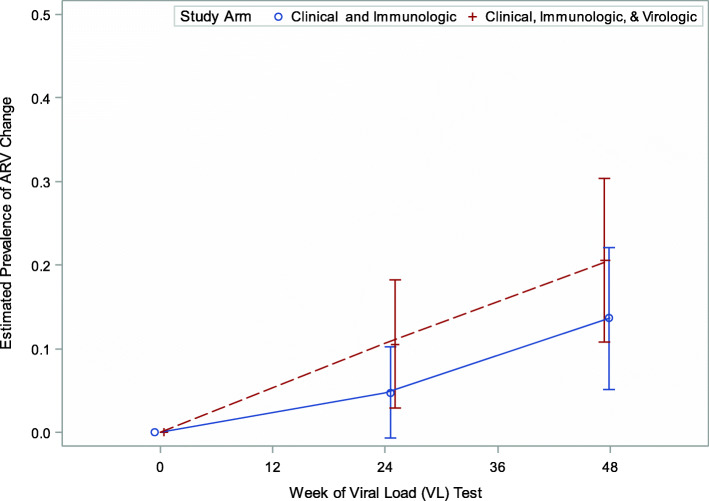 Results: At baseline all children (n = 142) were on NNRTI based ART (75% Nevirapine, 25% efavirenz). One third of ART-experienced children had detectable VL at baseline despite high CD4%. Median age was 6 years (interquartile range [IQR]: 5-9) and 43% were female. Overall, the odds of viral suppression were not different between study arms: (arm by week interaction, p = 0.63), adjusted odds ratio [aOR]: 1.07; 95%CI: 0.53, 2.17, p = 0.57) and did not change over time (aOR: 0 vs 24 week: 1.15; 95% CI: 0.91, 1.46, p = 0.24 and 0 vs 48 weeks: 1.26; 95%CI: 0.92, 1.74, p = 0.15). Longer duration of a child's ART exposure was associated with lower odds of viral suppression (aOR: 0.61; 95% CI: 0.42, 0.87, p < .01). Only 13% (9/71) of children with virologic failure were switched to second-line ART, in spite of access to real-time VL.