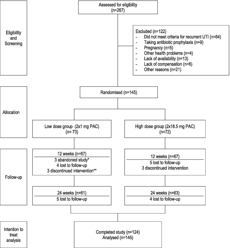 Material and methods: We recruited 145 healthy, adult women with a history of recurrent urinary tract infection, defined as ≥ 2 in the past 6 months or ≥ 3 in the past 12 months in this randomized, controlled, double-blind clinical trial. Participants were randomized to receive a high dose of standardized, commercially available cranberry proanthocyanidins (2 × 18.5 mg daily, n = 72) or a control low dose (2 × 1 mg daily, n = 73) for a 24-week period. During follow-up, symptomatic women provided urine samples for detection of pyuria and/or bacteriuria and received an appropriate antibiotic prescription. The primary outcome for the trial was the mean number of new symptomatic urinary tract infections during a 24-week intervention period. Secondary outcomes included symptomatic urinary tract infection with pyuria or bacteriuria.