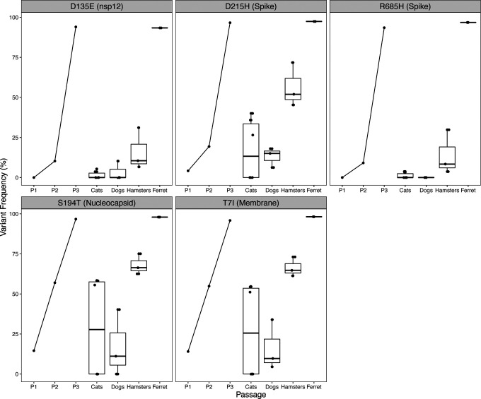 SARS-CoV-2 spillback from humans into domestic and wild animals has been well-documented. We compared variants of cell culture-expanded SARS-CoV-2 inoculum and virus recovered from four species following experimental exposure. Five nonsynonymous changes in nsp12, S, N and M genes were near fixation in the inoculum, but reverted to wild-type sequences in RNA recovered from dogs, cats and hamsters within 1-3 days post-exposure. Fourteen emergent variants were detected in viruses recovered from animals, including substitutions at spike positions H69, N501, and D614, which also vary in human lineages of concern. The rapidity of in vitro and in vivo SARS-CoV-2 selection reveals residues with functional significance during host-switching, illustrating the potential for spillback reservoir hosts to accelerate evolution, and demonstrating plasticity of viral adaptation in animal models.