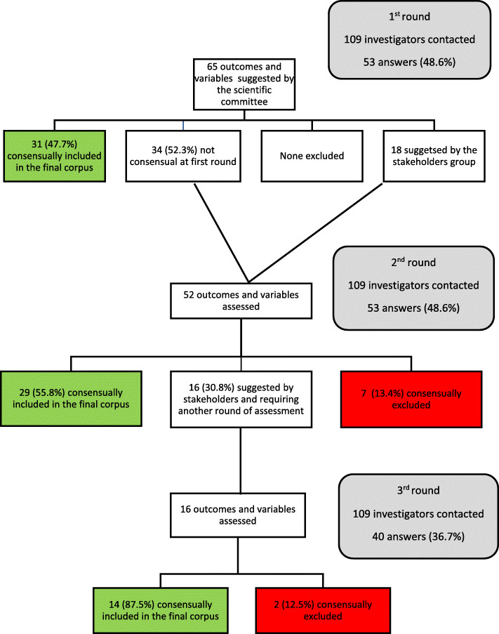 Methods: A list of outcomes and variables of interest was suggested to obstetricians participating in the INSTRUMODA study using online questionnaires divided into 7 categories: the woman's history and course of pregnancy, course of labor, modalities of operative delivery, episiotomy characteristics, immediate maternal morbidity, one-year maternal morbidity, immediate neonatal morbidity. We used a three-round DELPHI method to reach a consensus. In the first round, outcomes and variables considered as essential by 70% or more of obstetricians were included in the corpus whereas they were excluded when 70% rated them as "not important". In the second round, non-consensual outcomes and variables were reassessed and excluded or definitively included if considered as "not important" or essential by 50% or more of the obstetricians. During the first round, obstetricians were invited to suggest new outcomes and/or variables that were then assessed in the second and third round. We used the same method to develop a core outcome and variables of interest set in a population of women in the community recruited via an association of patients. At the end of the procedure the core outcome and variables of interest sets were merged to provide the final core outcome set for the INSTRUMODA study.