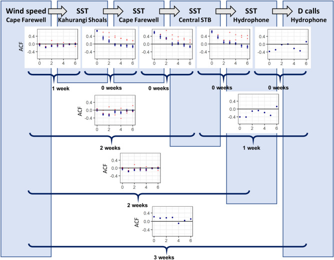 Temporal and spatial lags between wind, coastal upwelling, and blue whale occurrence