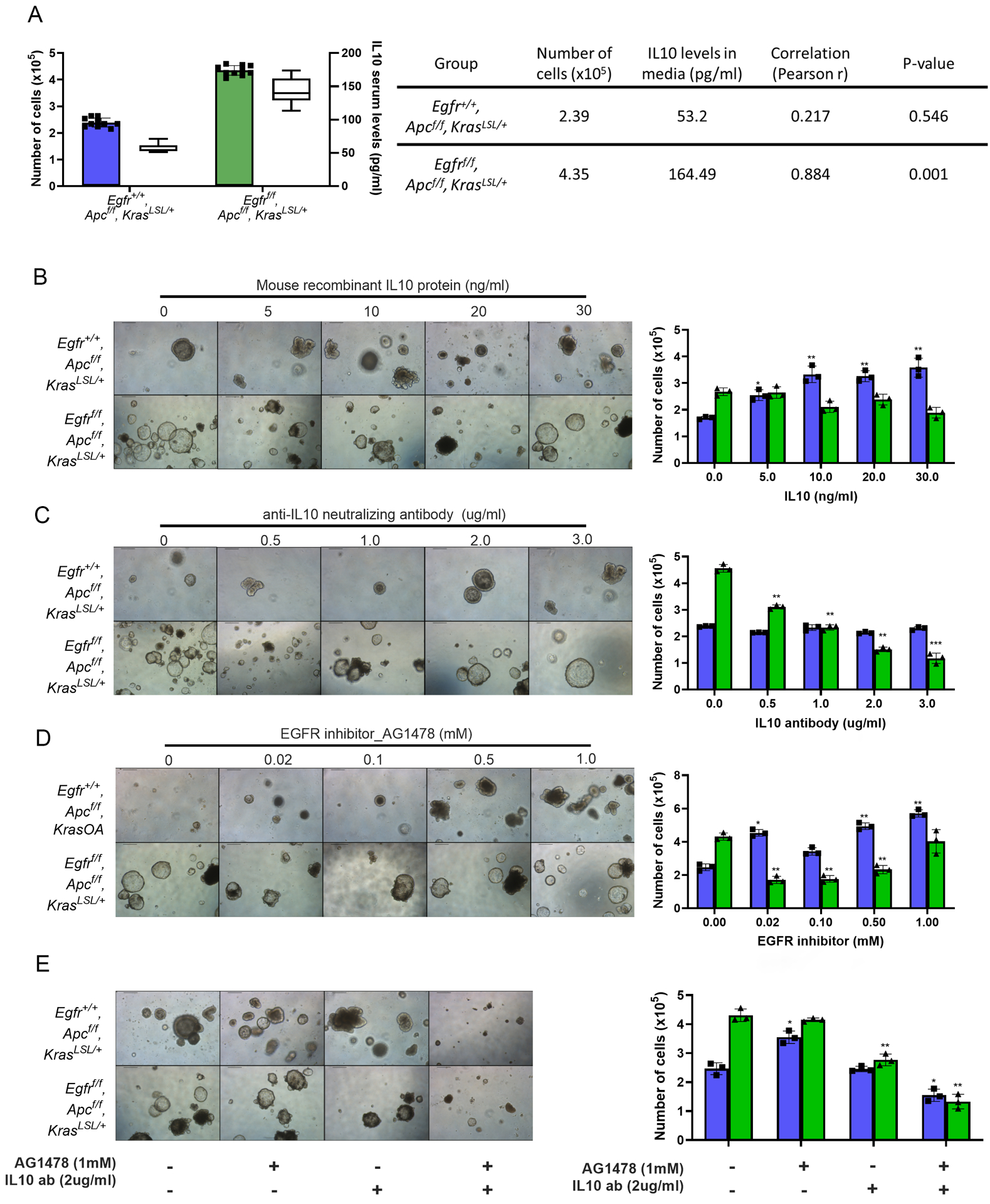 Although epidermal growth factor receptor (EGFR)-targeted therapies are approved for colorectal cancer (CRC) treatment, only 15% of CRC patients respond to EGFR inhibition. Here, we show that colorectal cancers (CRC) can initiate and grow faster through an EGFR-independent mechanism, irrespective of the presence of EGFR, in two different mouse models using tissue-specific ablation of Egfr. The growth benefit in the absence of EGFR is also independent of Kras status. An EGFR-independent gene expression signature, also observed in human CRCs, revealed that anergy-inducing genes are overexpressed in EGFR-independent polyps, suggesting increased infiltration of anergic lymphocytes promotes an accelerated growth rate that is partially caused by escape from cell-mediated immune responses. Many genes in the EGFR-independent gene expression signature are downstream targets of interleukin 10 receptor alpha (IL10RA). We further show that IL10 is detectable in serum from mice with EGFR-independent colon polyps. Using organoids in vitro and Src ablation in vivo, we show that IL10 contributes to growth of EGFR-independent CRCs, potentially mediated by the well-documented role of SRC in IL10 signaling. Based on these data, we show that the combination of an EGFR inhibitor with an anti-IL10 neutralizing antibody results in decreased cell proliferation in organoids and in decreased polyp size in pre-clinical models harboring EGFR-independent CRCs, providing a new therapeutic intervention for CRCs resistant to EGFR inhibitor therapies.