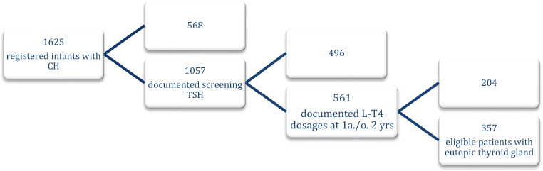 Neonatal screening for congenital primary hypothyroidism (CH) may not distinguish between transient (TCH) and permanent dysfunction (PCH), causing potential overtreatment and concerns in affected families. To specify the indication for interruption of therapy, we analysed the German registry "HypoDok" for infants with CH, which oversees 1625 patients from 49 participating centres in Germany and Austria from 1997 until today. A total of 357 patients with a thyroid gland in loco typico were identified and retrospectively grouped according to cessation (TCH, n = 24) or continuation (PCH, n = 333) of L-thyroxine (L-T4) treatment at 2 years of age. The receiver operating characteristic (ROC) analysis was performed to identify cutoffs predicting TCH by screening TSH concentrations and L-T4 dosages. Gestational ages, birth weights and prevalence of associated malformations were comparable in both groups. The cutoff screening TSH concentration was 73 mU/L. The cutoff daily L-T4 dosage at 1 year was 3.1 μg/kg (90% sensitivity, 63% specificity; 36 μg/day) and at 2 years of age 2.95 μg/kg (91% sensitivity, 59% specificity; 40 μg/day). At 2 years of age, specificity (71%) increased when both of these parameters were considered together.Conclusion: The decision to continue or cease L-T4 treatment at 2 years of age in CH patients diagnosed in neonatal screening may be based on their screening TSH concentrations and individual L-T4 dosages at 1 and 2 years of age. Thus, TCH and PCH may be distinguished; overtreatment avoided; and affected families reassured. What is Known: • The course of congenital primary hypothyroidism may be transient, causing potential overtreatment. • The dose of l-thyroxine at 1 or 2 years of age may predict a transient course of primary congenital hypothyroidism. What is New: • TSH screening concentration and l-thyroxine dosages at 1 and 2 years of age represent reliable predictors for transient congenital primary hypothyroidism with higher sensitivity and specificity when considered together in order to select eligible patients who qualify for treatment withdrawal.