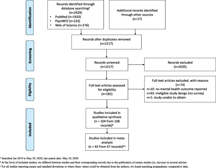 Methods: For this systematic review and meta-analyses, we systematically searched PubMed, PsycINFO, and Web of Science from January 1, 2019 to May 29, 2020, and screened reference lists of included studies. In addition, we searched PubMed and PsycINFO for prepandemic comparative data. Survey studies assessing mental burden by the SARS-CoV-2 pandemic in the general population, healthcare workers, or any patients (eg, COVID-19 patients), with a broad range of eligible mental health outcomes, and matching studies evaluating prepandemic comparative data in the same population (if available) were included. We used multilevel meta-analyses for main, subgroup, and sensitivity analyses, focusing on (perceived) stress, symptoms of anxiety and depression, and sleep-related symptoms as primary outcomes.
