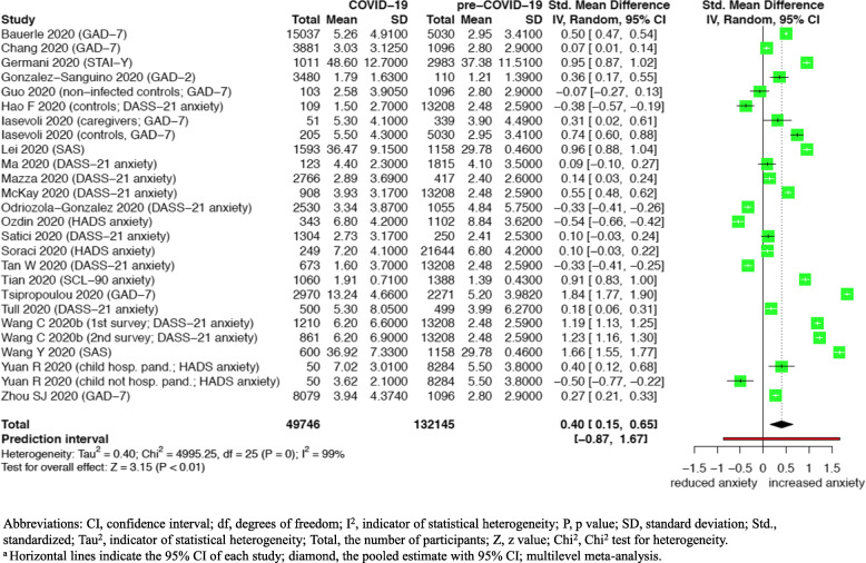 Results: Of 2429 records retrieved, 104 were included in the review (n = 208,261 participants), 43 in the meta-analysis (n = 71,613 participants). While symptoms of anxiety (standardized mean difference [SMD] 0.40; 95% CI 0.15-0.65) and depression (SMD 0.67; 95% CI 0.07-1.27) were increased in the general population during the early phase of the pandemic compared with prepandemic conditions, mental burden was not increased in patients as well as healthcare workers, irrespective of COVID-19 patient contact. Specific outcome measures (eg, Patient Health Questionnaire) and older comparative data (published ≥5 years ago) were associated with increased mental burden. Across the three population groups, existing mental disorders, female sex, and concerns about getting infected were repeatedly reported as risk factors, while older age, a good economic situation, and education were protective.