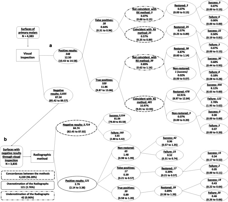 Results: 4383 proximal and occlusal surfaces of deciduous molars in 216 preschool children were diagnosed and treated according to the abovementioned diagnostic strategies and followed-up for 24 months. The assessment of radiographs made change the initial decision reached by visual inspection in about 30% of the surfaces when all types of interventions were considered. However, most disagreements occurred for initial lesions, where radiographs tended to underestimate them. Discordances between methods occurred in less than 5% of all surfaces when considered lesions requiring operative treatment. For discrepancy cases, the placed interventions guided by following the radiographic results did not present less failures against those made following only visual inspection. As a matter of fact, the use of radiographs in the diagnostic strategy for caries detection in children brought more harms than benefits due to the occurrence of false-positives, overdiagnosis and lead-time bias.