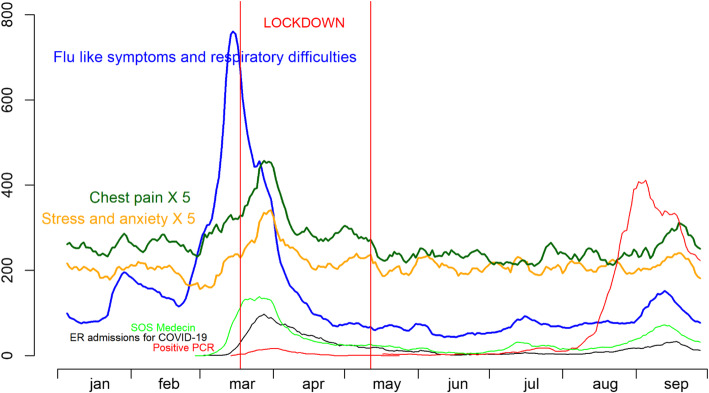 Results: The number of daily calls for flu-like symptoms began to increase from February 21, 2020 and reached an unprecedented level by February 28, 2020 and peaked on March 14, 2020, 3 days before lockdown. It was strongly correlated with daily emergency room admissions, with a delay of 14 days. Calls for chest pain and stress and anxiety, peaked 12 days later. Calls for malaises with loss of consciousness, non-voluntary injuries and alcohol intoxications sharply decreased, starting one month before lockdown. No noticeable trends in relation to lockdown was found for other groups of reasons including gastroenteritis and abdominal pain, stroke, suicide and self-harm, pregnancy and delivery problems.