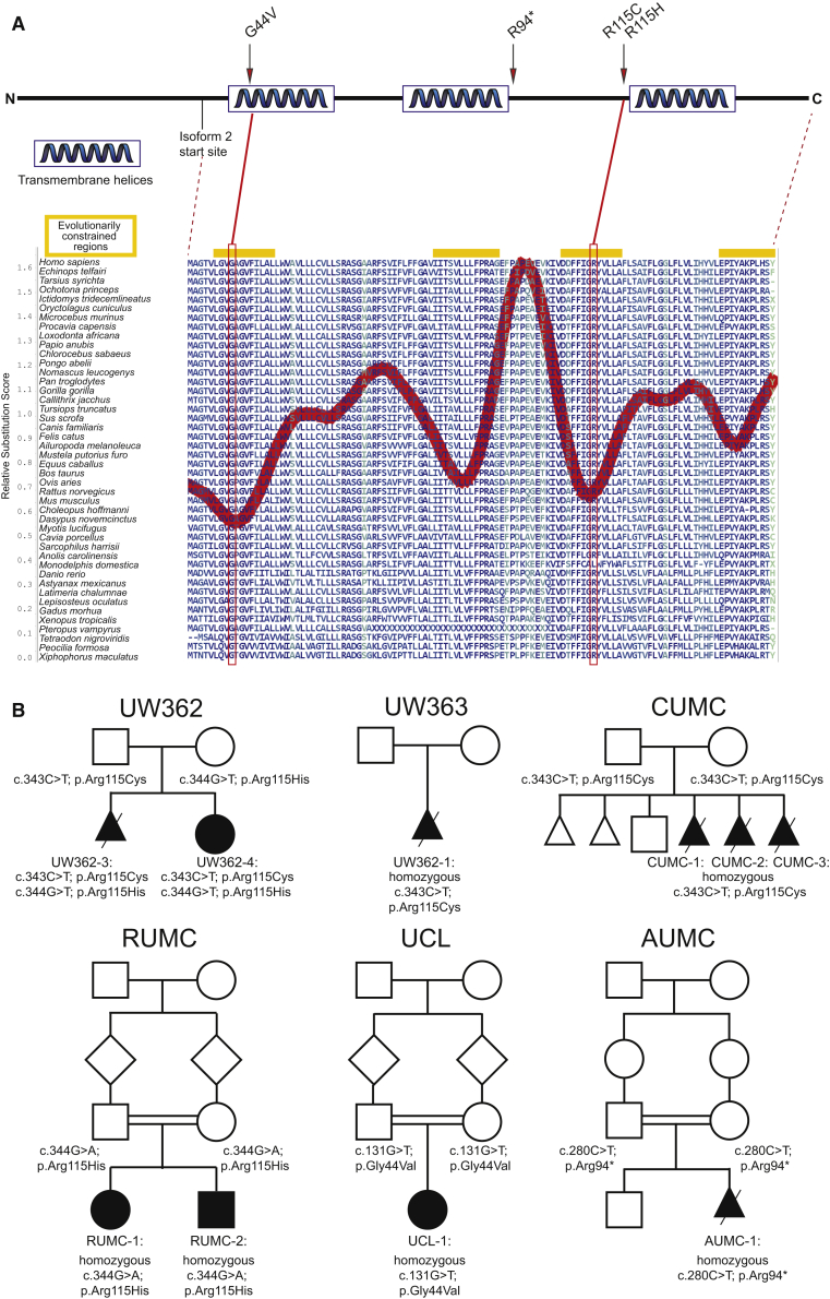 The Joubert-Meckel syndrome spectrum is a continuum of recessive ciliopathy conditions caused by primary cilium dysfunction. The primary cilium is a microtubule-based, antenna-like organelle that projects from the surface of most human cell types, allowing them to respond to extracellular signals. The cilium is partitioned from the cell body by the transition zone, a known hotspot for ciliopathy-related proteins. Despite years of Joubert syndrome (JBTS) gene discovery, the genetic cause cannot be identified in up to 30% of individuals with JBTS, depending on the cohort, sequencing method, and criteria for pathogenic variants. Using exome and targeted sequencing of 655 families with JBTS, we identified three individuals from two families harboring biallelic, rare, predicted-deleterious missense TMEM218 variants. Via MatchMaker Exchange, we identified biallelic TMEM218 variants in four additional families with ciliopathy phenotypes. Of note, four of the six families carry missense variants affecting the same highly conserved amino acid position 115. Clinical features included the molar tooth sign (N = 2), occipital encephalocele (N = 5, all fetuses), retinal dystrophy (N = 4, all living individuals), polycystic kidneys (N = 2), and polydactyly (N = 2), without liver involvement. Combined with existing functional data linking TMEM218 to ciliary transition zone function, our human genetic data make a strong case for TMEM218 dysfunction as a cause of ciliopathy phenotypes including JBTS with retinal dystrophy and Meckel syndrome. Identifying all genetic causes of the Joubert-Meckel spectrum enables diagnostic testing, prognostic and recurrence risk counseling, and medical monitoring, as well as work to delineate the underlying biological mechanisms and identify targets for future therapies.