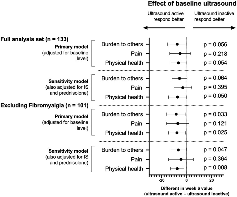 Results: Of 133 patients, 78 had a positive US. Only 53 (68%) of these had one or more swollen joint. Of 66 patients with one or more swollen joint, 20% had a negative US. A positive US was associated with joint swelling, symmetrical small joint distribution and serology. The primary endpoint was not met: in the full analysis set (N = 133) there was no difference in baseline-adjusted EMS-VAS at week 2 [-7.7 mm (95% CI -19.0, 3.5); P = 0.178]. After excluding 32 patients with FM, response was significantly better in patients with a positive US at baseline [baseline-adjusted EMS-VAS at 2 weeks -12.1 mm (95% CI -22.2, -0.1); P = 0.049]. This difference was greater when adjusted for treatment [-12.8 mm (95% CI -22, -3); P = 0.007]. BILAG and SLEDAI responses were higher in US-positive patients.