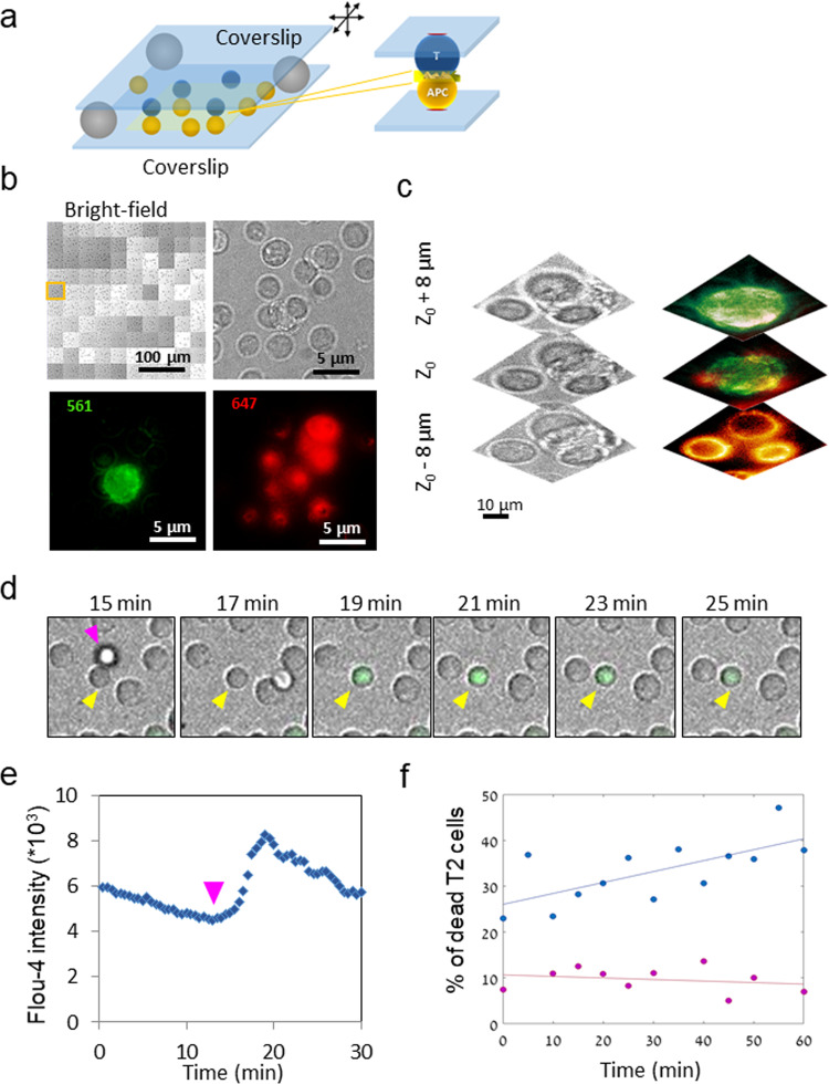 Cell-cell interfaces convey mechanical and chemical information in multicellular systems. Microscopy has revealed intricate structure of such interfaces, yet typically with limited resolution due to diffraction and unfavourable orthogonal orientation of the interface to the coverslip. We present a simple and robust way to align cell-cell interfaces in parallel to the coverslip by adhering the interacting cells to two opposing coverslips. We demonstrate high-quality diffraction-limited and super-resolution imaging of interfaces (immune-synapses) between fixed and live CD8+ T-cells and either antigen presenting cells or melanoma cells. Imaging methods include bright-field, confocal, STED, dSTORM, SOFI, SRRF and large-scale tiled images. The low background, lack of aberrations and enhanced spatial stability of our method relative to existing cell-trapping techniques allow use of these methods. We expect that the simplicity and wide-compatibility of our approach will allow its wide dissemination for super-resolving the intricate structure and molecular organization in a variety of cell-cell interfaces.