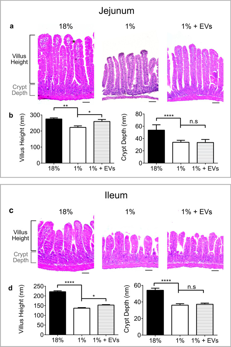 Malnutrition impacts approximately 50 million children worldwide and is linked to 45% of global mortality in children below the age of five. Severe acute malnutrition (SAM) is associated with intestinal barrier breakdown and epithelial atrophy. Extracellular vesicles including exosomes (EVs; 30-150 nm) can travel to distant target cells through biofluids including milk. Since milk-derived EVs are known to induce intestinal stem cell proliferation, this study aimed to examine their potential efficacy in improving malnutrition-induced atrophy of intestinal mucosa and barrier dysfunction. Mice were fed either a control (18%) or a low protein (1%) diet for 14 days to induce malnutrition. From day 10 to 14, they received either bovine milk EVs or control gavage and were sacrificed on day 15, 4 h after a Fluorescein Isothiocyanate (FITC) dose. Tissue and blood were collected for histological and epithelial barrier function analyses. Mice fed low protein diet developed intestinal villus atrophy and barrier dysfunction. Despite continued low protein diet feeding, milk EV treatment improved intestinal permeability, intestinal architecture and cellular proliferation. Our results suggest that EVs enriched from milk should be further explored as a valuable adjuvant therapy to standard clinical management of malnourished children with high risk of morbidity and mortality.