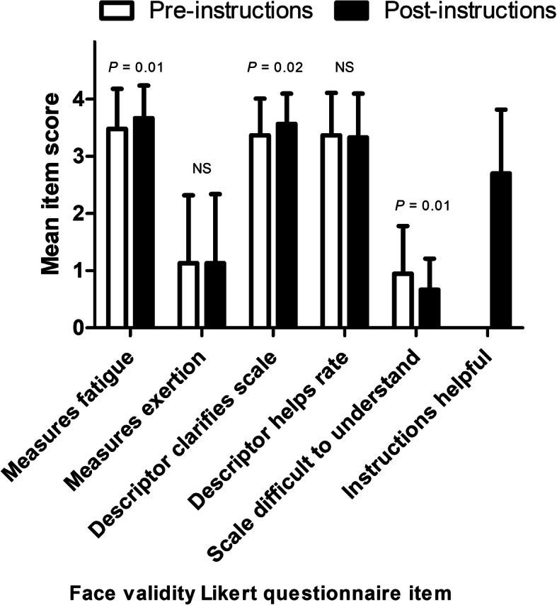 Results: The results from phase 1 demonstrated comparability and interpretability between the original and back-translated ROF scale. In phase 2, participants reported a high face validity, with a score of 3.48 ± 0.70 out of 4 when given the item probing whether the scale "measures fatigue". This score further improved (3.67 ± 0.57, P = 0.01) after participants read the accompanying instructions. Participants were able to distinguish the purposes of the scale for measuring fatigue rather than exertion. In phase 3, strong correlations were found between ROF and heart rate (HR) both during exercise (r = 0.91, P < 0.01) and recovery (r = 0.92, P < 0.01), while discriminant validity between ROF and rating of perceived exertion (RPE) was found during recovery.