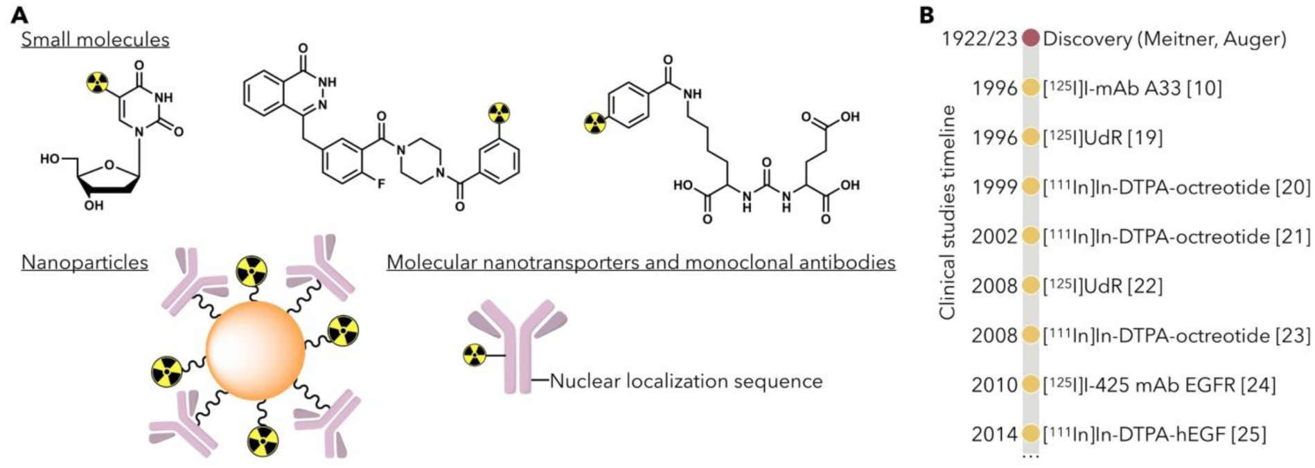First reported by Lise Meitner in 1922 and independently by Pierre Auger in 1923, the Auger effect has been explored as a potential source for targeted radiotherapy. The Auger effect is based on the emission of a low energy electron (typically <25 keV) from an atom post electron capture (EC), internal conversion (IC), or incident X-rays excitation. This phenomenon can cause the emission of a primary electron and multiple electron tracks typically in the nearest proximity of the emission site (2-500 nm). The short range of the emitted Auger cascade results in medium/high levels of linear energy transfer (4-26 keV/μm) exerted on the surrounding tissue. This property makes Auger emitters the ideal candidates for delivering high levels of targeted radiation to a specific target with dimensions comparable to, for example, the DNA. By using a targeting vector such as a small molecule, peptide or antibody, one has the potential of delivering high levels of radiation to tumor specific biomarkers while circumventing off-site toxicity in healthy cells; a challenge which is harder to overcome when using other, longer range sources of radiation such as beta and alpha emitting radionuclides. Several reviews on Auger emitters have been published over the years with two recent examples. For these reviews and others, we support their analysis and therefore to avoid simple repetition, this commentary will seek to address additional aspects and viewpoints. Specifically, we will focus on those most promising preclinical and clinical studies using small molecules, peptides, antibodies and how these studies may serve as a template for future studies.