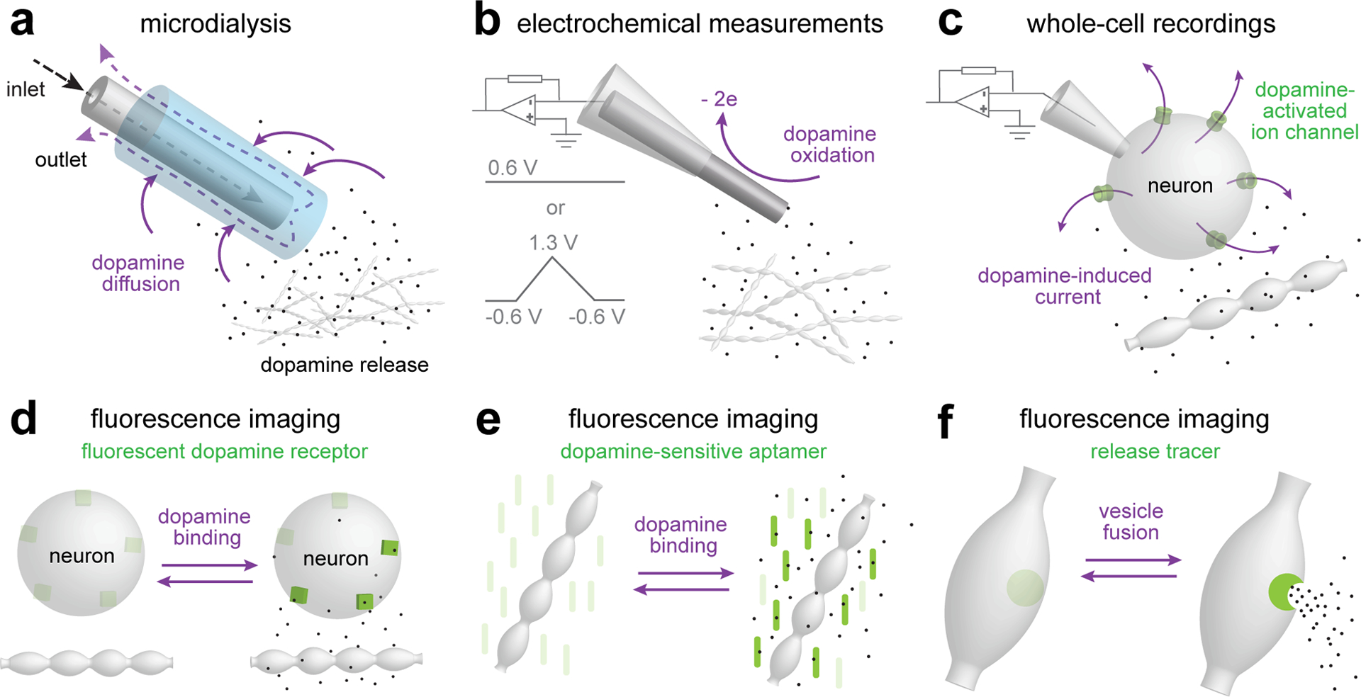 Dopamine is a prototypical neuromodulator that controls circuit function through G protein-coupled receptor signalling. Neuromodulators are volume transmitters, with release followed by diffusion for widespread receptor activation on many target cells. Yet, we are only beginning to understand the specific organization of dopamine transmission in space and time. Although some roles of dopamine are mediated by slow and diffuse signalling, recent studies suggest that certain dopamine functions necessitate spatiotemporal precision. Here, we review the literature describing dopamine signalling in the striatum, including its release mechanisms and receptor organization. We then propose the domain-overlap model, in which release and receptors are arranged relative to one another in micrometre-scale structures. This architecture is different from both point-to-point synaptic transmission and the widespread organization that is often proposed for neuromodulation. It enables the activation of receptor subsets that are within micrometre-scale domains of release sites during baseline activity and broader receptor activation with domain overlap when firing is synchronized across dopamine neuron populations. This signalling structure, together with the properties of dopamine release, may explain how switches in firing modes support broad and dynamic roles for dopamine and may lead to distinct pathway modulation.