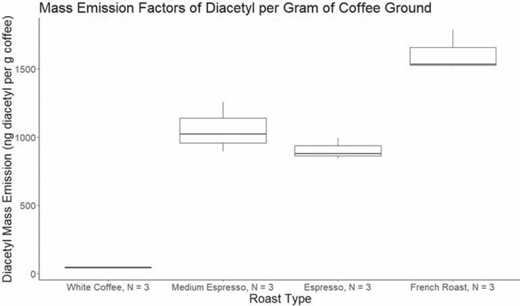 Results: Diacetyl concentrations in five of the seven personal samples from the craft roastery were above the United States National Institute of Occupational Safety and Health (NIOSH) Recommended Exposure Limit (REL) of 5 ppb as an 8-h time-weighted average (TWA)-and one of the seven personal samples exceeded the NIOSH REL for 2,3-pentanedione-9.3 ppb as an 8-h TWA. Median diacetyl and 2,3-pentanedione emissions were highest at the bagging machine followed by the grinder, roaster, barista, and background areas. The arithmetic mean diacetyl concentrations from the seven personal samples collected from café patrons was 3.96 ppb, suggesting that diacetyl exposure poses a negligible health risk to café patrons. Correlations between diacetyl and total VOCs, CO, and CO2 showed that diacetyl was well correlated with total VOCs, but poorly correlated with CO and CO2. Based on our limited emissions study, French roast was associated with the highest mass emission factor of diacetyl.