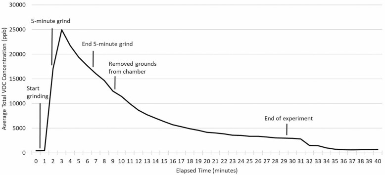 Methods: Exposure and area concentration data for diacetyl and 2,3-pentanedione were collected over 4 days of sampling at a single coffee roaster and associated café. Additional measurements of café patrons' exposure to diacetyl were collected in seven other craft roastery/cafes in Seattle, WA. For the emissions experiments, integrated area air samples for diacetyl were collected using sorbent tubes over 30-min intervals for each roast type with the sorbent tubes positioned next to a grinder placed in an exposure chamber. Sorbent tubes were analyzed for alpha-diketones using gas chromatography-mass spectrometry. A photoionization detector (PID) was also used to measure continuous total VOC concentrations at the coffee roastery, and during each grinding experiment.