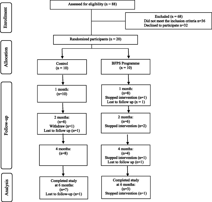 Methods: We conducted a feasibility and pilot randomised controlled trial. Twenty primiparous women intending to breastfeed their healthy term singleton infant were recruited from a hospital in Kowloon, Hong Kong between February and March 2019. Participants were randomly allocated to the intervention or control group. Participants in the intervention group received five home-based visits with a peer supporter over a six month period, as well as standard care, whereas participants in the control group received standard care only. We assessed feasibility, compliance, and acceptability of the breastfeeding peer support programme. Other outcomes assessed were breastfeeding self-efficacy, duration, and exclusivity.