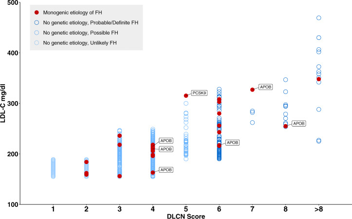 We investigated monogenic and polygenic causes of hypercholesterolemia in a population-based cohort, excluding secondary hypercholesterolemia, and using an established framework to identify pathogenic variants. We studied 1682 individuals (50.2 ± 8.6 years, 41.3% males) from southeast Minnesota with primary hypercholesterolemia (low-density lipoprotein cholesterol (LDL-C) ≥155 mg/dl in the absence of identifiable secondary causes). Familial hypercholesterolemia (FH) phenotype was defined as a Dutch Lipid Clinic Network (DLCN) score ≥6. Participants underwent sequencing of LDLR, APOB, and PCSK9, and genotyping of 12 LDL-C-associated single-nucleotide variants to construct a polygenic score (PGS) for LDL-C. The presence of a pathogenic/likely pathogenic variant was considered monogenic etiology and a PGS ≥90th percentile was considered polygenic etiology. The mean LDL-C level was 187.3 ± 32.3 mg/dl and phenotypic FH was present in 8.4% of the cohort. An identifiable genetic etiology was present in 17.1% individuals (monogenic in 1.5% and polygenic in 15.6%). Phenotypic and genetic FH showed poor overlap. Only 26% of those who met the clinical criteria of FH had an identifiable genetic etiology and of those with an identifiable genetic etiology only 12.9% met clinical criteria for FH. Genetic factors explained 7.4% of the variance in LDL-C. In conclusion, in adults with primary hypercholesterolemia, 17.1% had an identifiable genetic etiology and the overlap between phenotypic and genetic FH was modest.
