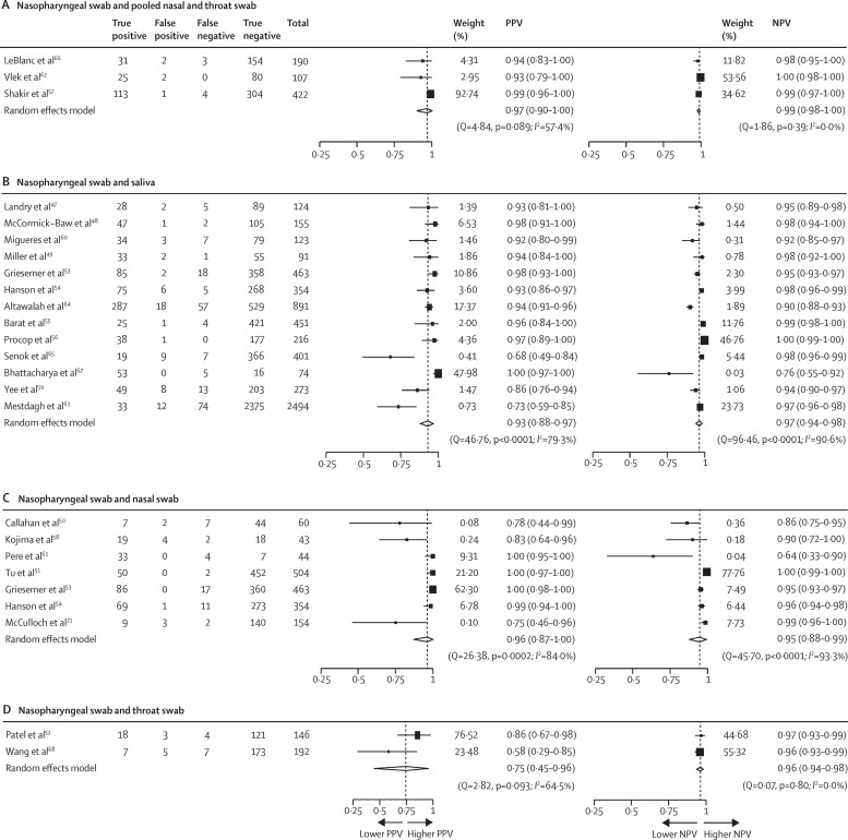 Findings: Of the 5577 studies identified in our search, 23 studies including 7973 participants with 16 762 respiratory samples were included. Respiratory specimens examined in these studies included 7973 nasopharyngeal swabs, 1622 nasal swabs, 6110 saliva samples, 338 throat swabs, and 719 pooled nasal and throat swabs. Using nasopharyngeal swabs as the gold standard, pooled nasal and throat swabs gave the highest sensitivity of 97% (95% CI 93-100), whereas lower sensitivities were achieved by saliva (85%, 75-93) and nasal swabs (86%, 77-93) and a much lower sensitivity by throat swabs (68%, 35-94). A comparably high positive predictive value was obtained by pooled nasal and throat (97%, 90-100) and nasal swabs (96%, 87-100) and a slightly lower positive predictive value by saliva (93%, 88-97). Throat swabs have the lowest positive predictive value of 75% (95% CI 45-96). Comparably high specificities (range 97-99%) and negative predictive value (range 95-99%) were observed among different clinical specimens. Comparison between health-care-worker collection and self-collection for pooled nasal and throat swabs and nasal swabs showed comparable diagnostic performance. No significant heterogeneity was observed in the analysis of pooled nasal and throat swabs and throat swabs, whereas moderate to substantial heterogeneity (I2 ≥30%) was observed in studies on saliva and nasal swabs.
