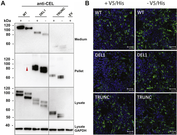 Variable number of tandem repeat (VNTR) sequences in the genome can have functional consequences that contribute to human disease. This is the case for the CEL gene, which is specifically expressed in pancreatic acinar cells and encodes the digestive enzyme carboxyl ester lipase. Rare single-base deletions (DELs) within the first (DEL1) or fourth (DEL4) VNTR segment of CEL cause maturity-onset diabetes of the young, type 8 (MODY8), an inherited disorder characterized by exocrine pancreatic dysfunction and diabetes. Studies on the DEL1 variant have suggested that MODY8 is initiated by CEL protein misfolding and aggregation. However, it is unclear how the position of single-base deletions within the CEL VNTR affects pathogenic properties of the protein. Here, we investigated four naturally occurring CEL variants, arising from single-base deletions in different VNTR segments (DEL1, DEL4, DEL9, and DEL13). When the four variants were expressed in human embryonic kidney 293 cells, only DEL1 and DEL4 led to significantly reduced secretion, increased intracellular aggregation, and increased endoplasmic reticulum stress compared with normal CEL protein. The level of O-glycosylation was affected in all DEL variants. Moreover, all variants had enzymatic activity comparable with that of normal CEL. We conclude that the longest aberrant protein tails, resulting from single-base deletions in the proximal VNTR segments, have highest pathogenic potential, explaining why DEL1 and DEL4 but not DEL9 and DEL13 have been observed in patients with MODY8. These findings further support the view that CEL mutations cause pancreatic disease through protein misfolding and proteotoxicity, leading to endoplasmic reticulum stress and activation of the unfolded protein response.
