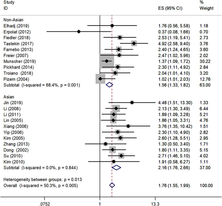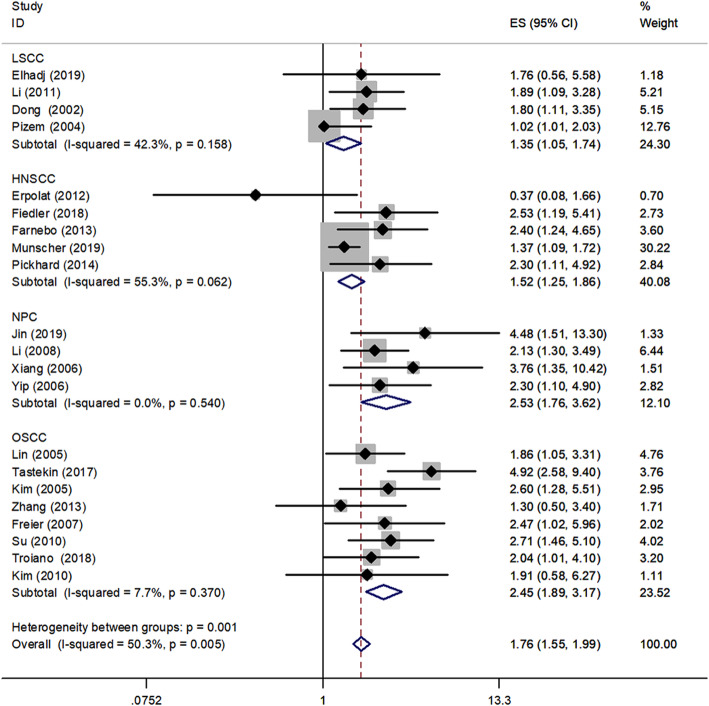 Results: Twenty eight studies with 4891 patients were finally included in this meta-analysis, the pooled analysis indicated that the survivin expression was significantly correlated with poorer overall survival (OS) (HR, 2.02; 95% CI, 1.65-2.47, P < 0.001), and poorer disease-free survival (DFS)/ disease-specific survival (DSS) (HR = 2.03, 95%CI: 1.64-2.52, P < 0.001; HR = 1.92, 95%CI: 1.41-2.60, P < 0.001, receptively). Similar results were observed in subgroup analysis stratified by different cancer types, such as laryngeal squamous cell carcinoma (LSCC) (HR = 1.35, 95%CI: 1.05-1.74, P < 0.001), oral squamous cell carcinomas (OSCC) (HR = 2.45, 95%CI: 1.89-3.17, P < 0.001), nasopharyngeal carcinoma (NPC) (HR = 2.53, 95%CI: 1.76-3.62, P < 0.001) and HNSCC (HR = 1.52, 95%CI: 1.25-1.86, P < 0.001). Furthermore, ethnicity-stratified analysis indicated that survivin was significantly associated with poorer OS among both Asian and Non- Asian HNSCC patients (HR = 2.16, 95%CI: 1.76-2.66; HR = 1.56, 95%CI: 1.33-1.82, respectively).